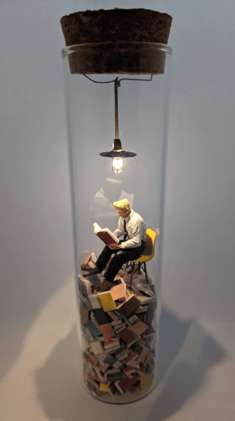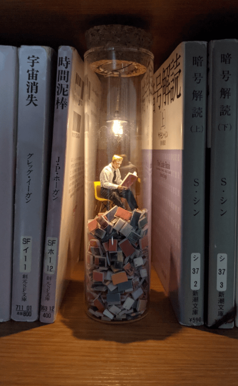 You will be fascinated by the delicate and beautiful world of the "test tube diorama", which expresses the sad atmosphere of a bibliophile reading on a mountain of beloved books.